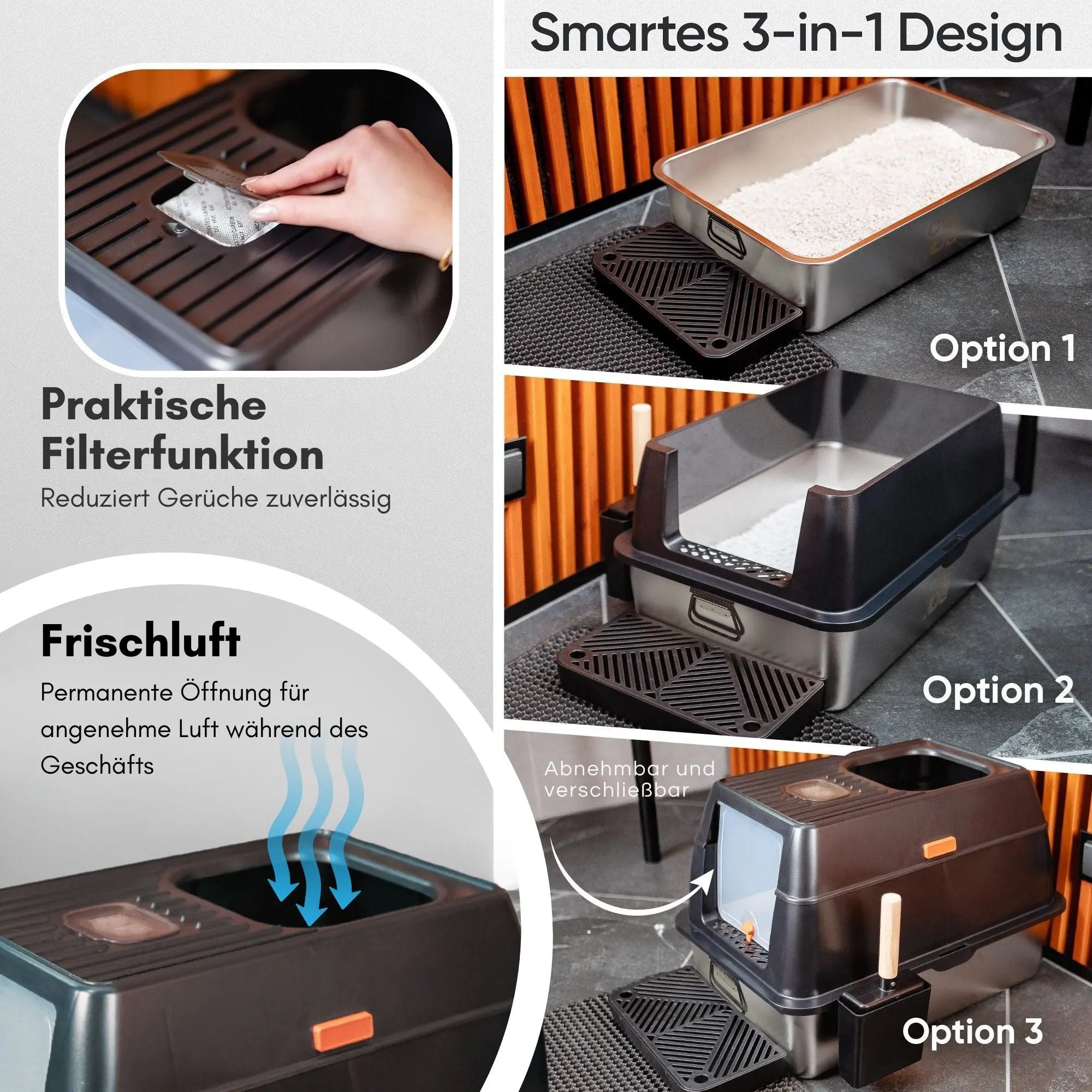 - Nachhaltig & hygienisch: Hochwertige Katzentoilette aus Edelstahl – geruchsreduzierend, langlebig und einfach zu reinigen. Kein Plastik, keine Geruchsbildung.