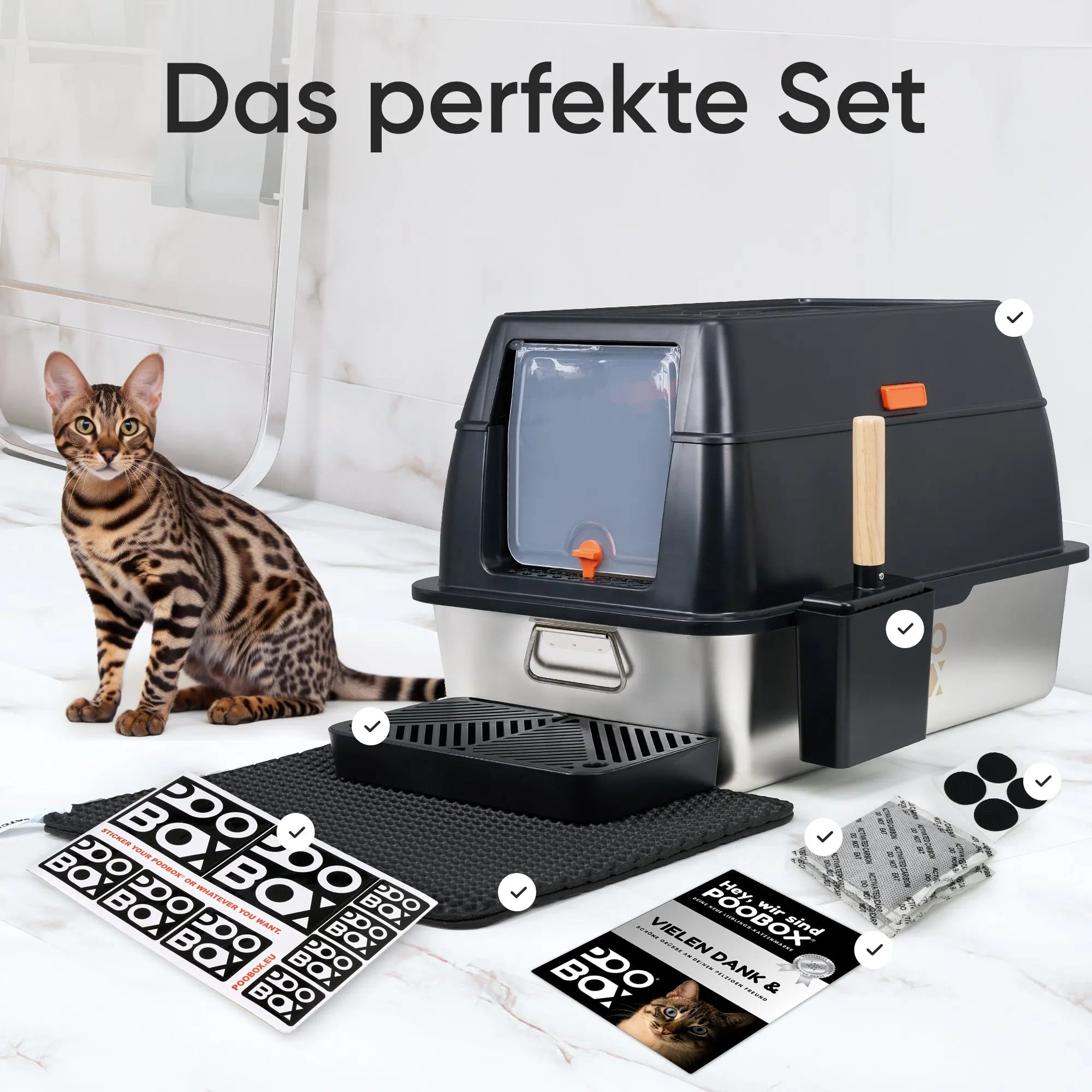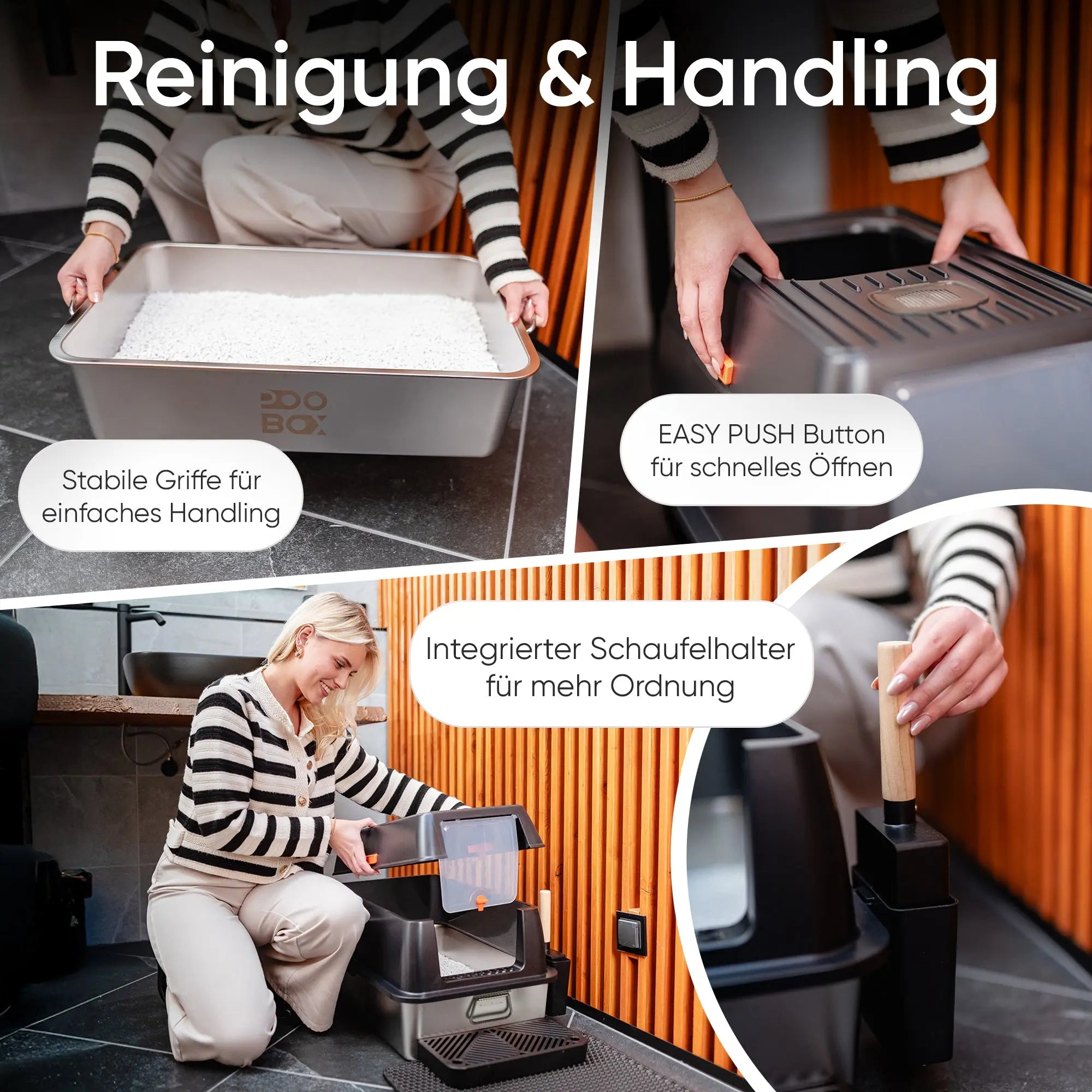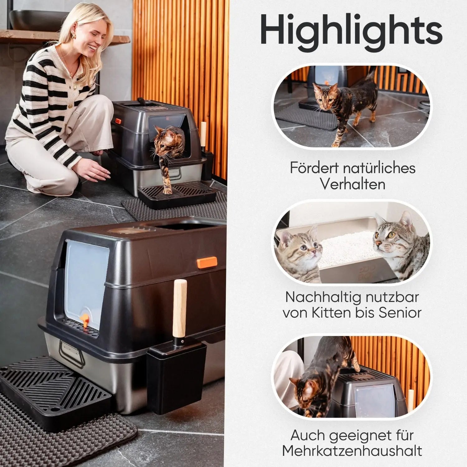 Die POOBOX® kombiniert hochwertige Materialien mit einem durchdachten Design und vielen Funktionen, die dir die Reinigung erleichtern und unangenehme Gerüche minimieren. Dank des hochwertigen Edelstahls ist sie langlebig, hygienisch und pflegeleicht – das bedeutet weniger Reinigungsaufwand, eine bessere Raumluft und eine zufriedene Katze.