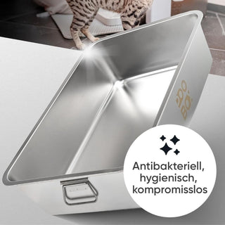 Die POOBOX® Wanne ist aus hochwertigem, stabilen und verwindungsfreien Edelstahl. Dieses ist langlebig und nachhaltig. Es lässt sich einfach und umweltschonend reinigen und verhindert den typischen Katzenklo Geruch, den man von herkömmlichen Plastikklos kennt.